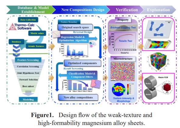 EXTENDED ABSTRACT: As a structural material with low density and high speciffc strength, magnesium alloy is one of the main candidate materials to respond to the current global climate crisis and control carbon emissions. However, magnesium alloys are difficult and costly to process at room temperature, which greatly limits their widespread applications. The difficult-to-process characteristics of magnesium alloys are mainly due to the strong basal texture caused by its hexagonal crystal structure during processing. Therefore, solving the problem of difffcult processing of magnesium alloys can be achieved by reducing the strength of the basal texture produced during processing. We combined machine learning, thermodynamic calculations, inverse design and forward screening to design the compositions and supporting key processes of several new rare-earth magnesium alloys with weak texture, good room temperature formability and ductility. The designed alloy composition, supporting key processes, and corresponding texture and mechanical properties have been well veriffed experimentally.